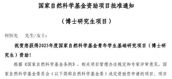 学院博士生何恒先获批2025年度国家自然科学基金青年学生基础研究项目(博士研究生)
