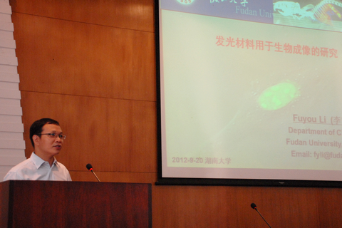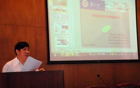 应国家重点实验室邀请,2012年9月20日,复旦大学特聘教授,博士生导师,国家杰出青年科学基金获得者李富友教授来 哔咔官网 讲学,作了题为“发光材料用于生物成像的研究”的学术报告,受到了广大师生的热烈欢迎,杨荣华教授主持学术报告。