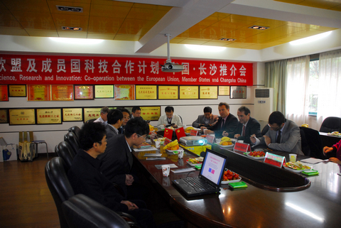 校长助理何益斌教授、国际合作交流处处长左权文教授代表学校参加会议并致欢迎辞。期间,欧盟及来自法国与德国驻华大使馆的三位参赞与长沙及周边地区高等院校、科研院所和科技企业的代表,就可能展开的科学技术研究展开了深入地交流。在科学技术研究领域,中欧双方有着共同的发展理念:创新、绿色和可持续发展。双方希望能通过广泛的科技合作,共同寻找合理的科学技术发展道路,创建中欧科技合作新局面。