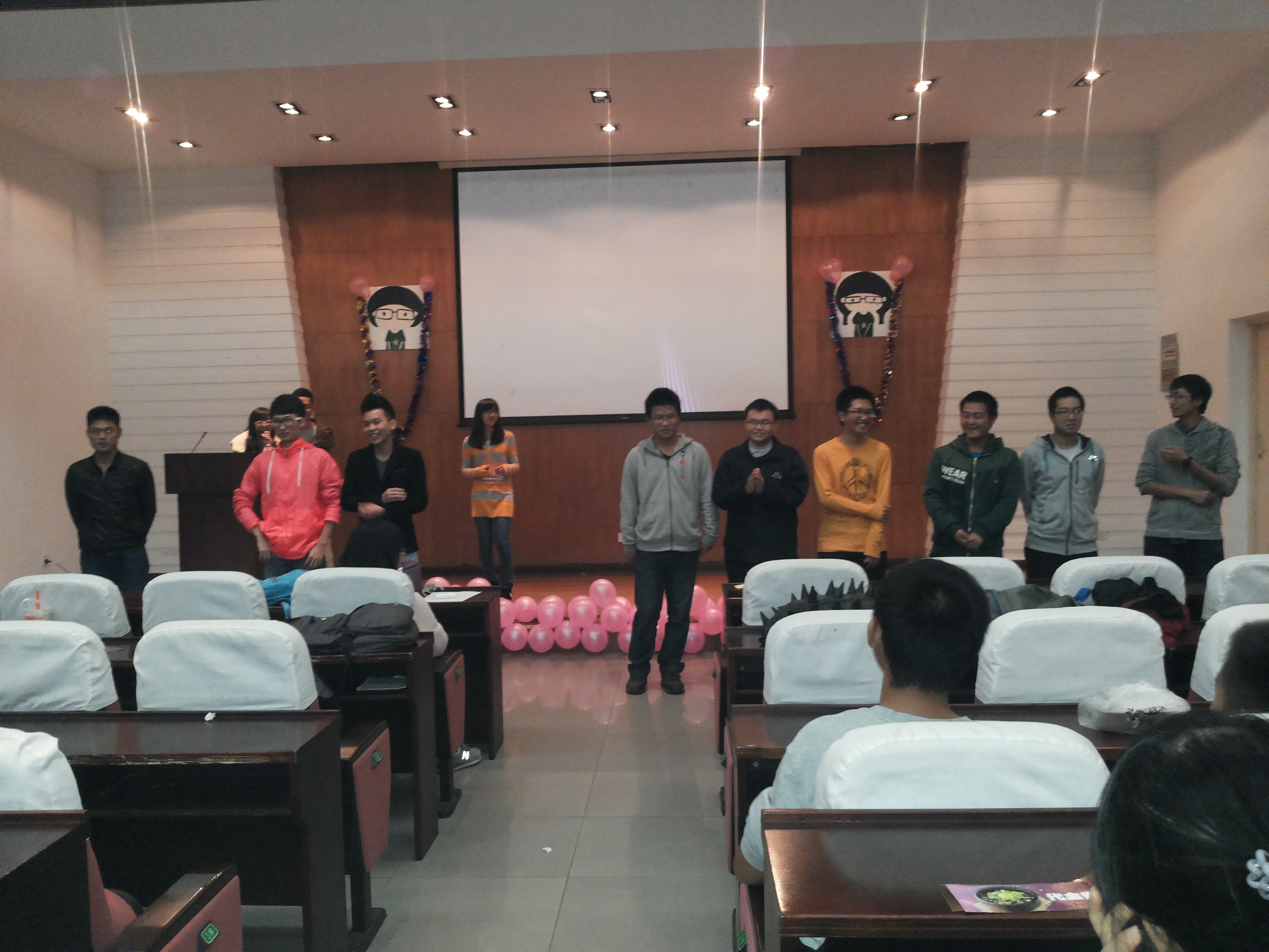 光棍节特别活动“非缘勿扰”在新化工楼D区报告厅如期举行。与室外的阴沉天气不同,报告厅此时被布置得温馨热闹,参赛选手和观众们早早来到报告厅,帮忙准备活动、互相交流,活动在轻松愉快的氛围中开始。