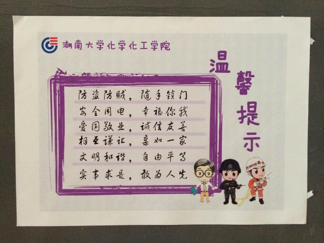 校训,以此提醒学生注意日常寝室安全,注意防火防盗安全用电,传播正确积极价值观,让学生在日常生活中注重自我修养,加强自我约束管理。