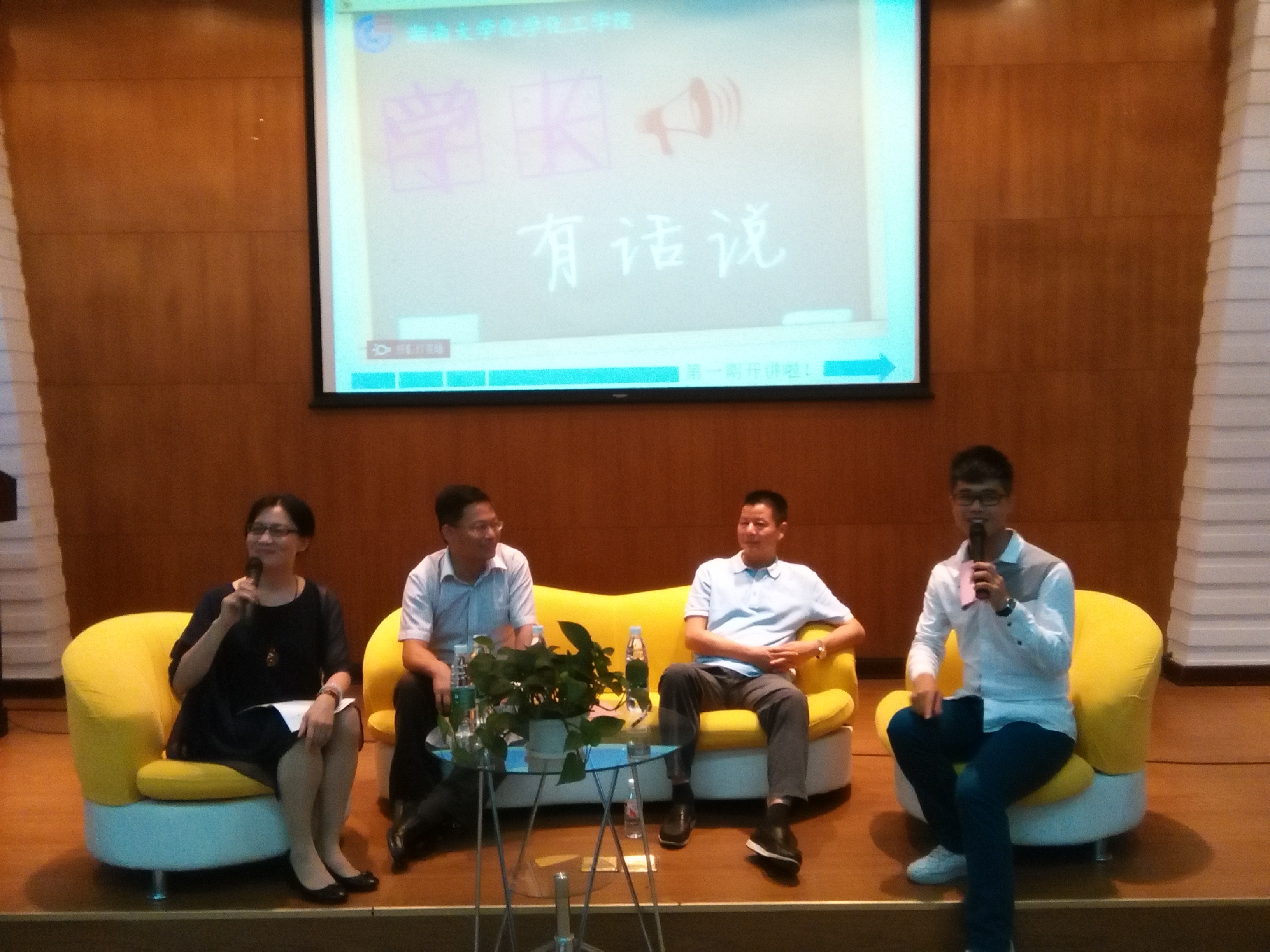 80级金属腐蚀与防护专业(即现在的应用化学专业)的郭志军、彭天剑学长及夏丽娟学姐。学院党委副书记陈义红老师、应用化学系主任刘娅莉教授、院分团委书记陈晓晖老师参加会议,访谈由吴天忍同学主持。