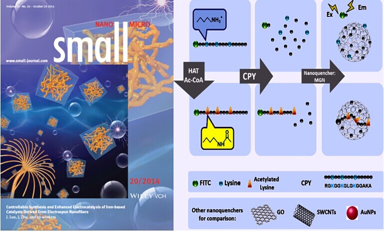 韩逸陶博士的坚持和毅力不仅体现在跑步运动上所取得的成绩,更鼓励着她在学术研究上孜孜进取,刻苦钻研,勇于创新。就在今年10月初,她在姚守拙院士、聂舟教授的指导下,在蛋白质乙酰化生物传感领域取得了重要的研究进展,发展了一种全新的蛋白质乙酰化免抗体识别原理,并建立了一种新型纳米荧光传感器用于蛋白质乙酰化酶检测。该研究成果发表在化学与材料领域顶尖学术期刊Small(DOI: 10.1002/smll.201401989,IF=7.514)上。