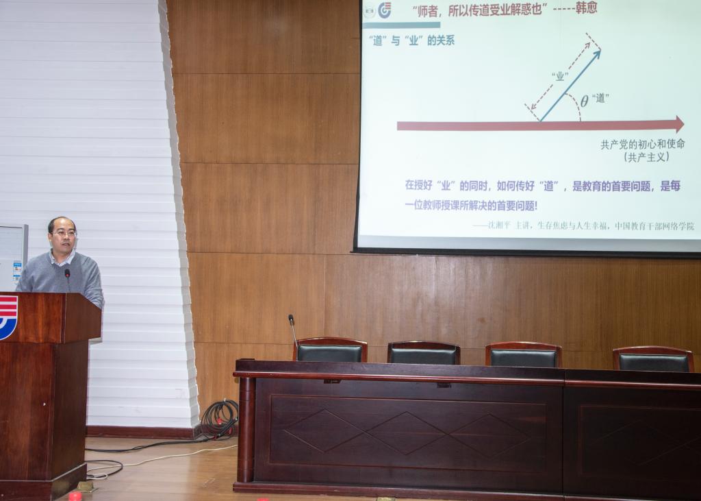 学院副院长李永军在《课程的天然组成部分——课程思政》报告中,对课程思政概念的形成、课程思政的意义、如何开展课程思政、课程思政建设规划进行了详细阐述,要求教师在授“业”的同时,更首要的是传好“道”。强调教师要有大胸怀、大境界和大格局,政治素质过硬,业务能力精湛,育人水平高超,方法技术娴熟,要构建“知识教育、能力培养、价值引领三位一体”的课程教学。同时强调,课程思政不是简单贴政治标签,应遵循既有课程知识体系,找准思政元素,有机融入、嵌入或渗入思想政治教育,做到润物无声。