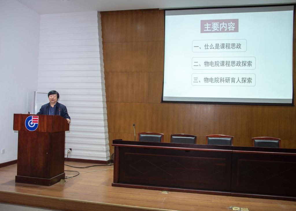 物理与微电子科学学院副院长陈克求以《以本为本 科教育人——物电院课程思政探索》为题,介绍了什么是课程思政,物电院的课程思政探索情况,并着重介绍了结合“本科生科研能力提升计划”建成的系统的育人体系,该体系打通育人、科研与教学之间的“隔墙”,建立教学、科研和育人合一的教学模式,使科学研究与思想政治教育有机融合,科学研究与课程教学紧密结合。