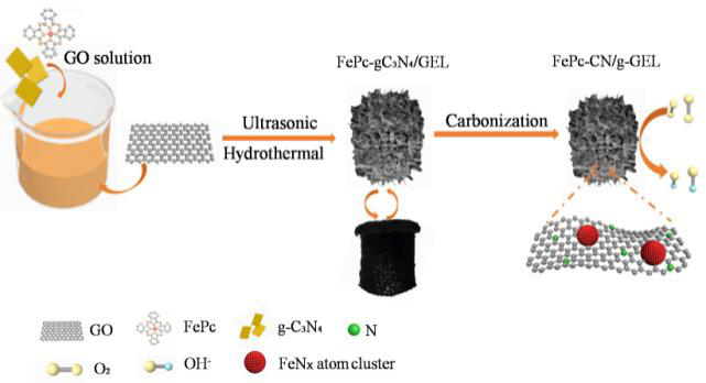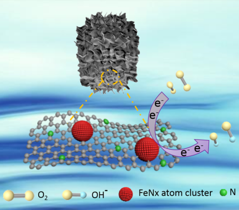质子交换膜燃料电池(PEMFC)被公认为电动车的终极电源。作为燃料电池的一个重要反应, 氧还原反应(ORR)由于其缓慢的动力学过程,目前车用燃料电池中常用的商用催化剂是贵金属Pt/C催化剂。而大规模推广燃料电池车的使用主要受限于Pt基催化剂在资源与成本、稳定性、抗CO中毒性等三个方面的限制。针对这些问题,研究和发展低成本的新型高稳定、高活性的非贵金属催化剂及简便易行的制备技术,是推动燃料电池技术应用的关键环节和有效途径。据此,洪敏等提出利用富氮的石墨烯气凝胶负载FeNx原子簇的方法,实现了氧还原催化活性位点FeNx在三维富氮多孔碳材料表面的原子级均匀分布,获得的FeNx-CN/g-GEL具有优异的稳定性、催化活性和高的金属利用率(840 mA mgFe-1at0.80V), 氧化原半波电位达到0.90V, 其性能优于商业应用的Pt/C催化剂及目前已报道的非贵金属催化剂。