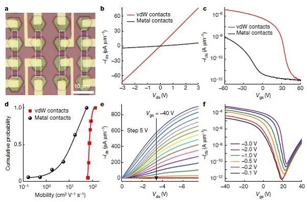 二维半导体有着超薄、对环境高度敏感的特性。因此在用传统热蒸发方式制备器件中的金属电极时容易损坏原子级薄的半导体沟道材料。研究人员用二维金属材料作为电极材料,用气相沉积合成二维金属纳米片/二维半导体垂直异质结阵列,获得良好的范德华电极-半导体界面。大量的原子结构表征表明合成的范德瓦尔斯异质结具有原子清晰、接近理想的范德瓦尔斯界面,轮廓分明的摩尔超晶格结构和广泛可调的摩尔超晶格周期尺寸。利用这种范德华接触制备的双层硒化钨场效应晶体管在沟道长度为1.8 μm时,开态电流高达900 μA/μm,这是在所有的已报道的单层或者双层过渡金属二硫族化合物室温半导体器件中是最大的,为制备可与硅晶体管竞争的二维材料晶体管带来了希望。测定得到双层WSe2沟道场效应晶体管的半导体载流子迁移率达到137 cm2V−1s−1,而且分布很窄。这清楚地表明制备的范德华异质结能在原子级厚度的二维新型半导体上形成高质量的电接触。同时研究人员在连续MoS2单层膜上制备了大规模VSe2/MoS2垂直异质结阵列(>12,000个),良率达~99%。实现了二维范德华金属/半导体垂直异质结阵列的规模化。研究成果为高性能新型器件的量产化提供了新的思路,为二维材料的发展,特别是在电子学、光电子学领域的应用奠定了坚实的基础。
