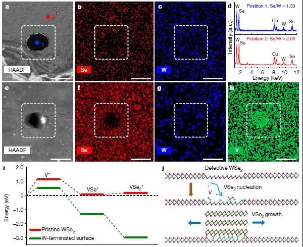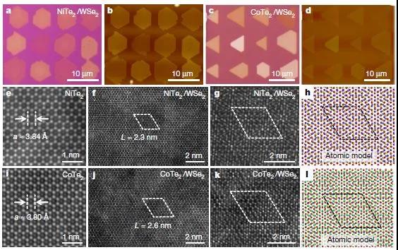 该研究成果开发了用激光烧蚀等技术在二维半导体原子晶体基底上定点制造缺陷阵列,金属纳米片在这些缺陷点成核能垒低,优先成核。控制超薄金属的生长条件,最终形成可控的超薄材料/原子级厚度半导体异质结阵列。这种策略适用于各种不同材料,不限于特定化学组成或晶格结构。作为演示,研究人员利用原子精确的,接近理想的范德华界面制造出各种二维范德华异质结,包括VSe2/WSe2,NiTe2 / WSe2,CoTe2/ WSe2,NbTe2 / WSe2,VS2 / WSe2,VSe2/ MoS2和VSe2 / WS2。生长在二维半导体上的二维金属性过渡金属硫化物均具有可设计的周期性排列特点和可在指定区域进行调控的横向尺寸,最终可以晶体管的沟道尺寸和调节电路的形态。