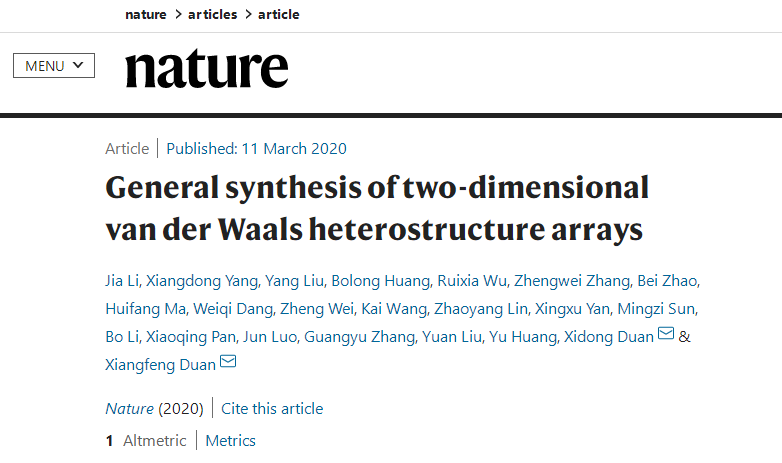 段曦东和美国加州大学洛杉矶分校段镶锋作为共同通讯作者,合作报道了一种可利用金属性过渡金属硫化物和半导体性过渡金属硫化物制备二维范德瓦尔斯异质结构阵列的通用合成方法,相关研究成果以题为“General synthesis of two-dimensional van der Waals heterostructure arrays”的文章在线发表在《Nature》上。 哔咔官网