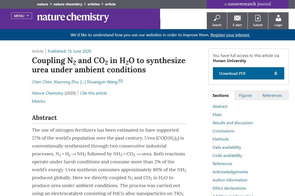 王双印教授首次在常温常压条件下通过电催化手段将氮气与二氧化碳直接偶联转化成尿素。相关研究以“Coupling N2 and CO2 in H2O to synthesize urea under ambient conditions”为题于2020年6月15日发表在《自然—化学》(Nature Chemistry)期刊上。