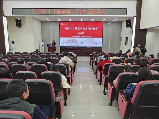 在新化工楼报告厅举行全院教职工集中政治理论学习,学院党委书记王玉枝宣讲党的十九届五中全会精神,学院全体教职工和学生党支部书记参加。