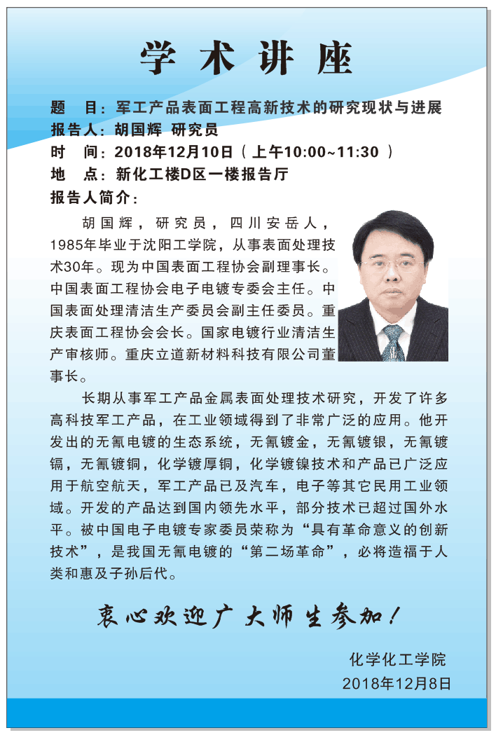 2018年12月10日重庆立道新材料有限公司胡国辉研究员学术报告会