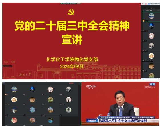 近日,化学系第一党支部、物理化学系党支部、化工系党支部组织党员同志以“学习贯彻党的二十届三中会精神”为主题,结合线上学习和线下讨论的方式,开展主题党日活动。